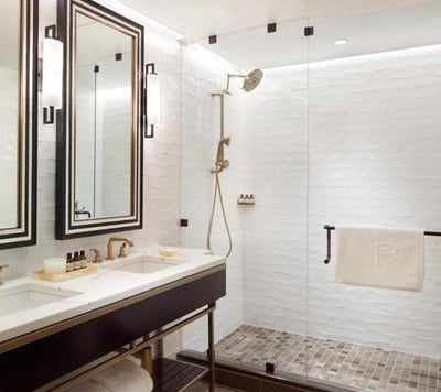 The vanity area has a sink, mirror, hairdryer, mini-refrigerator, microwave, coffee maker with coffee packets, ice bucket, paper drinking cups, and a sliding barn door for added privacy. A door also separates the bathroom which is equipped with a toilet, bathtub shower combo, bathmat, towels, and toiletries.